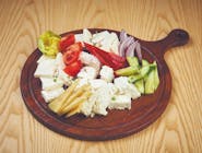 (conține lapte și produse derivate), Telemea de oaie, telemea de vacă, caș, brânză de oaie maturată, ceapă roșie, castravete, roșie, ardei gras.