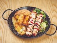 Frigărui de pui cu legume, cartofi copți, salată verde mixtă200/200/100g