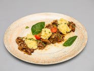 (conține gluten), Ficăței de pui, bacon, ciuperci, verdeață, piure de cartofi.